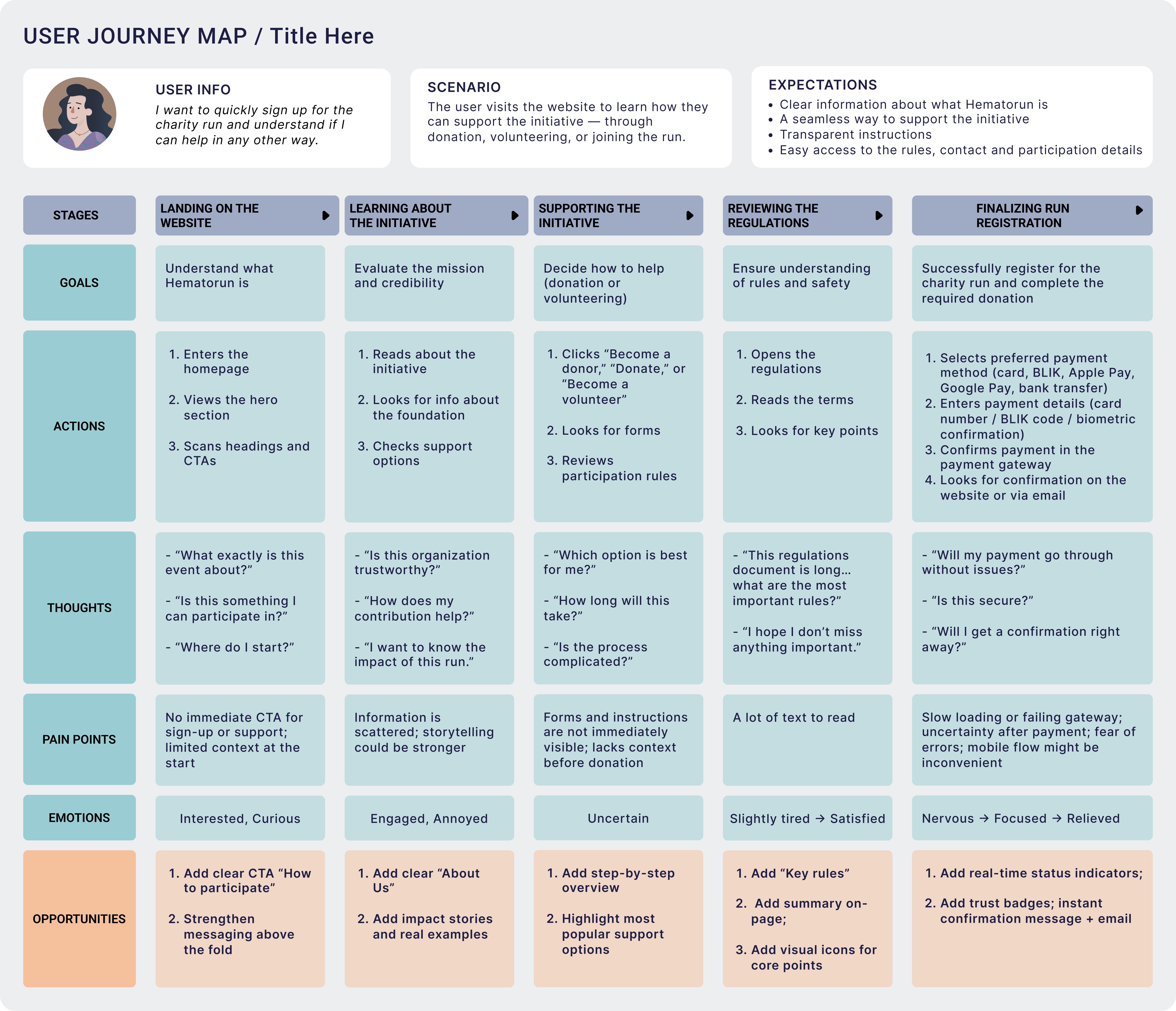 The project began with in-depth conversations with the Foundation’s team, during which we clarified the event’s purpose, gathered all essential information, and outlined the expectations for the website. We discussed visual direction, user needs, and the types of content required to effectively guide participants through the charity run registration process. Based on this, I mapped the initial User Journey and created a clear User Flow for sign-ups, ensuring the experience would feel simple and intuitive from the very first interaction.